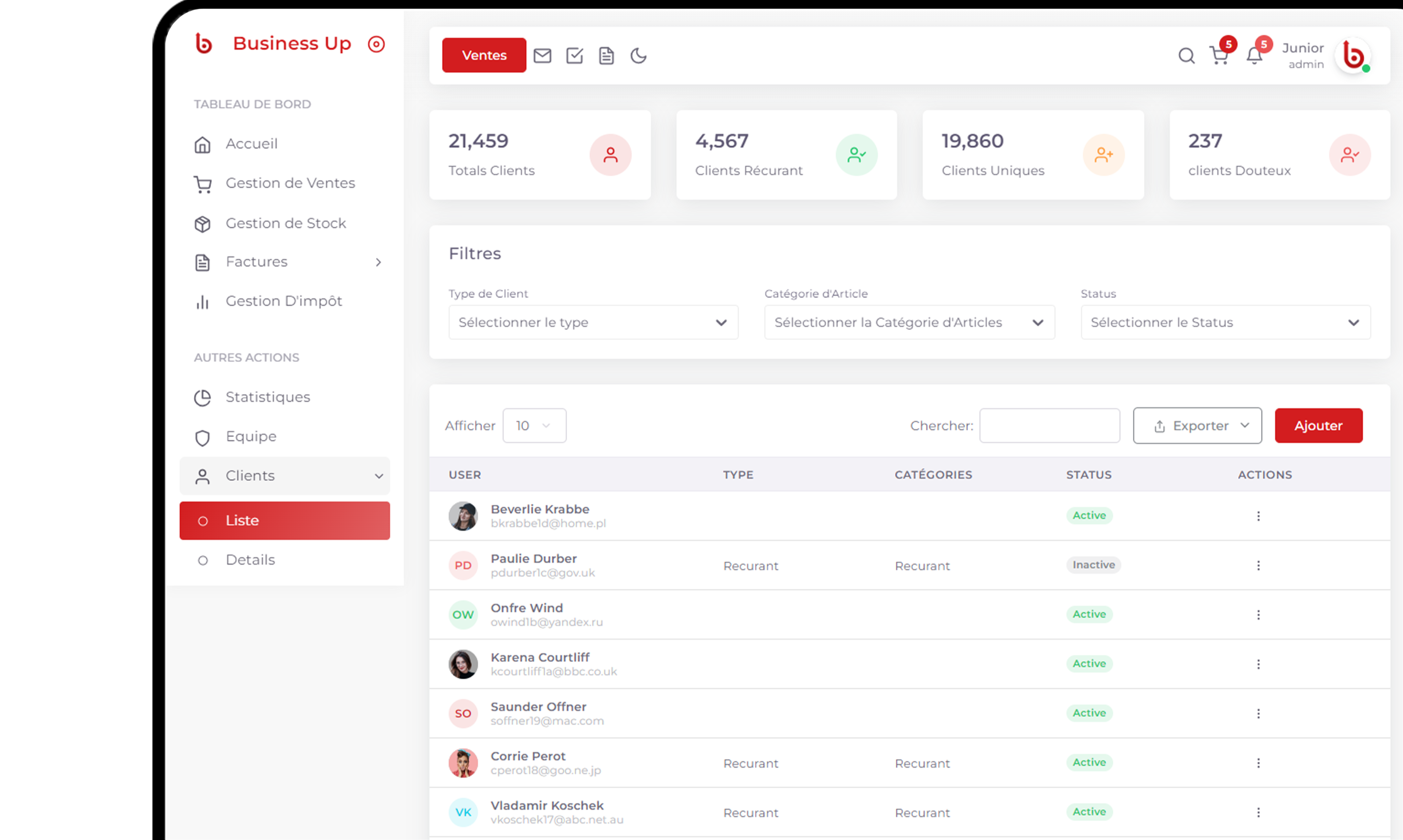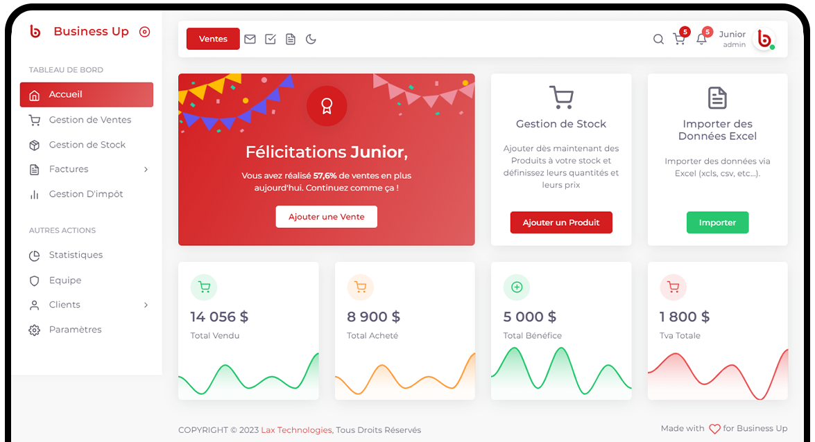 Vous tout gérer, même en déplacement, suivre les performances et rester connecté avec votre équipe, le tout avec une expérience fluide et intuitive. Plus besoin de compromis entre fonctionnalité et mobilité. Avec notre design réactif, restez aux commandes où que vous soyez, et gardez votre entreprise à portée de main, à tout moment.